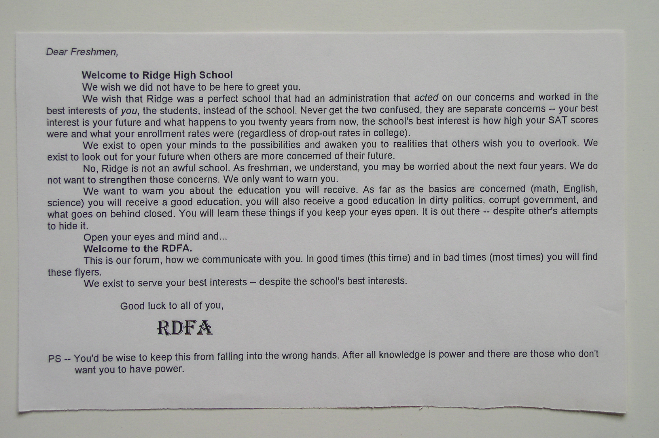 This archive is dedicated to the memory of the Rude Dude Foundation of America, a student run underground group that worked to better the lives of students and teachers in Ridge High School in Basking Ridge, New Jersey, USA.